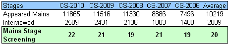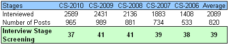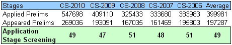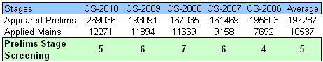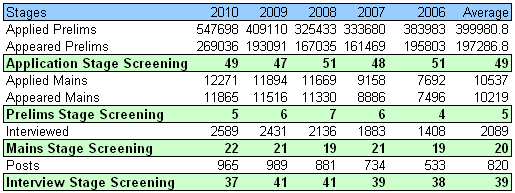 But is Indian Civil Services Exam that competitive? How many candidates applies for this exam and are eliminated (i.e. screened) at various stages – Prelims/Mains/Interview in Civil Services Exam? This is the subject matter of this blog article. I did an analysis of authentic data from the Annual reports of UPSC for the Civil Services Exam conducted for most recent five exams – from CS-2006 to CS-2010 (data for CS-2011 would be incorporated in the 62nd Annual report of UPSC, which has not been published so far).