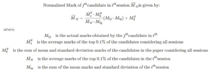 As CE, CS, EC, EE and ME papers held in multi session so in order to justify their level of difficulties and mark distribution GATE committee has arrived at the following formula for calculating the normalized marks.